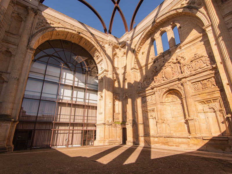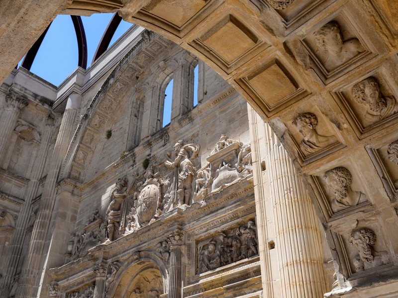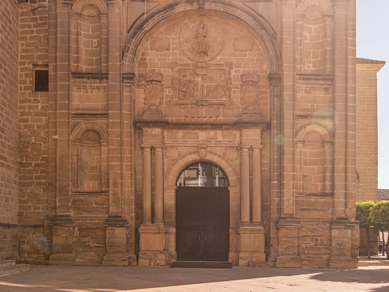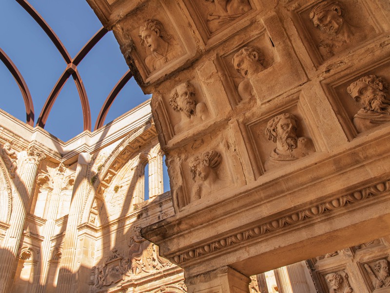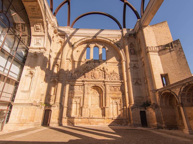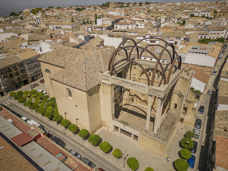 Un desastre mayúsculo, el gran terremoto de Lisboa de 1755, que se sintió con fuerza en buena parte de Andalucía, agrietó la bóveda de la capilla mayor y tuvo que ser desmontada para su reparación, labor que fue interrumpida después por la invasión napoleónica. Aún permanece la iglesia de cruz latina, a la que se accede por un gran arco de medio punto que enmarca toda la portada, con relieve de San Francisco y un tondo con la Virgen, que dan paso en la actualidad a un gran auditorio. También se conserva el claustro del convento, con una escalera de triple arcada y formado en la planta baja por arcos moldurados de medio punto sobre pilastras. La zona alta tiene ventanas rectangulares y dos de ellas están coronadas con medallones. Hoy el claustro está dedicado a uso hostelero.Busto de Andrés Vandelvira