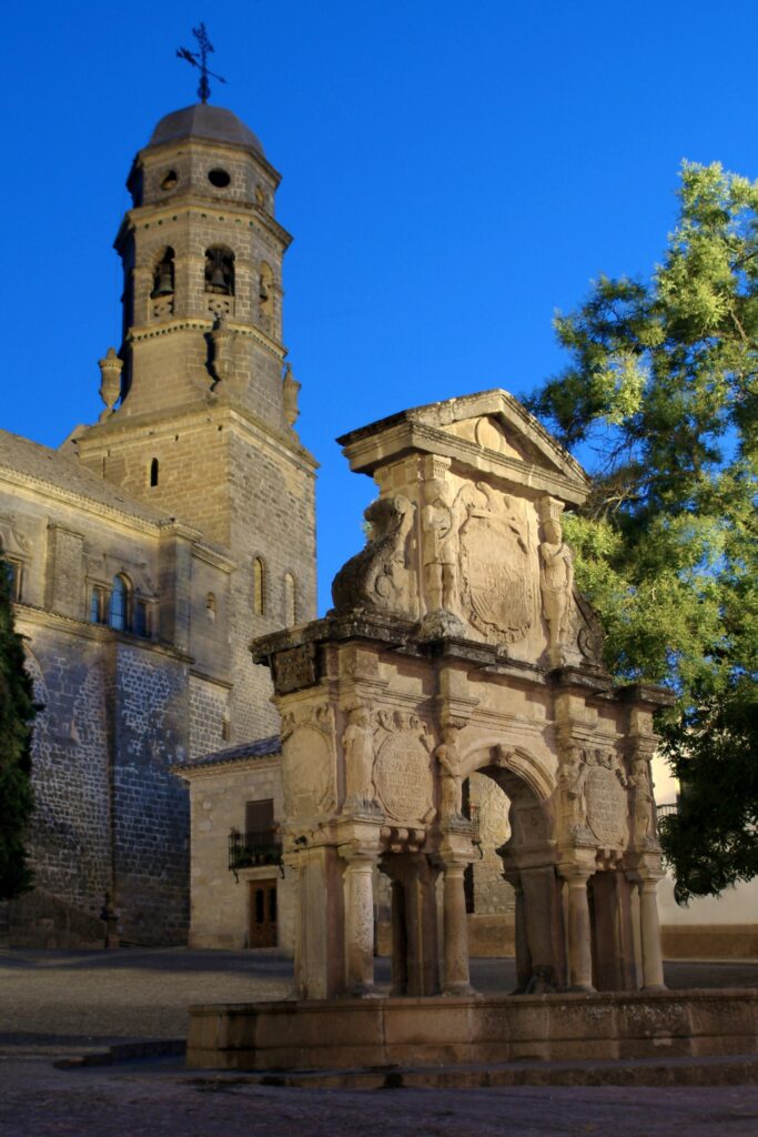 Estamos en el centro civil y religioso de la ciudad del momento, de ahí que para la conmemoración de la traída de las aguas a Baeza se realizará aquí esta fuente exenta, a modo de arco de triunfo en el año 1564, de la mano de Ginés Martínez de Aranda.